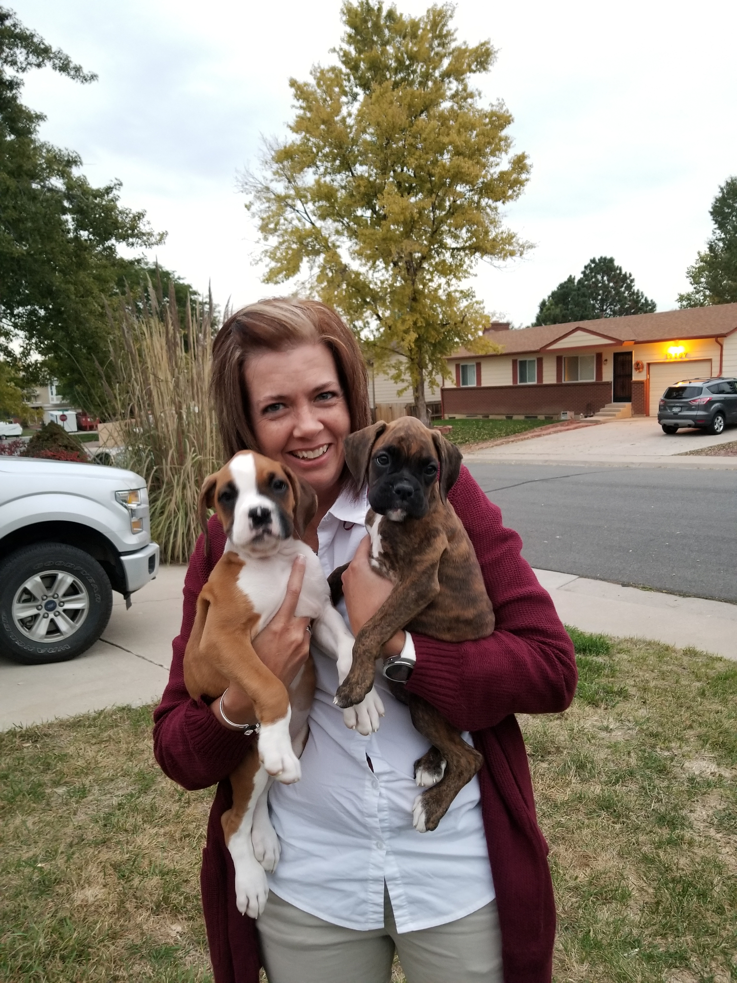 Thanks for your note, and yes, you did answer all of our questions! Ryan and I raved all the way home about how wonderful you are, and how very special your whole family is. The puppies have had a big day being introduced to everyone here at home, and we have adored cuddling with them. I've attached a couple pics!